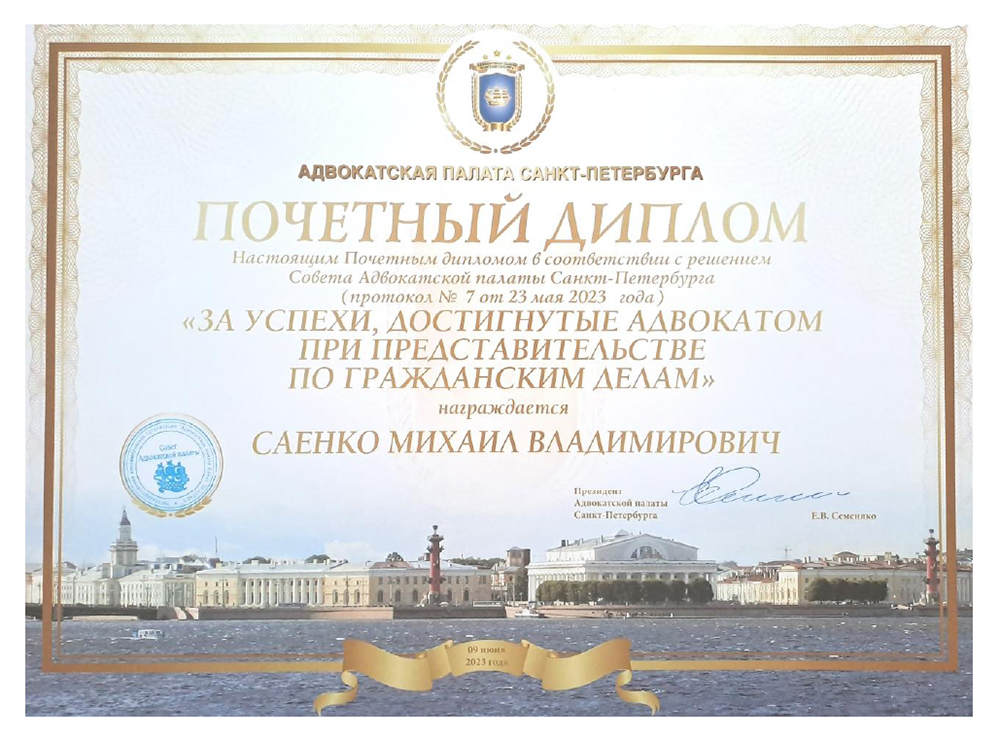 Решением Совета Адвокатской палаты Санкт-Петербурга от 23 мая 2023 года адвокат Саенко М. В. награжден почетным дипломом «За успехи, достигнутые адвокатом при представительстве по гражданским делам».